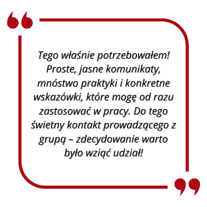 „Tego właśnie potrzebowałem! Proste, jasne komunikaty, mnóstwo praktyki i konkretne wskazówki, które mogę od razu zastosować w pracy. Do tego świetny kontakt prowadzącego z grupą – zdecydowanie warto było wziąć udział!”