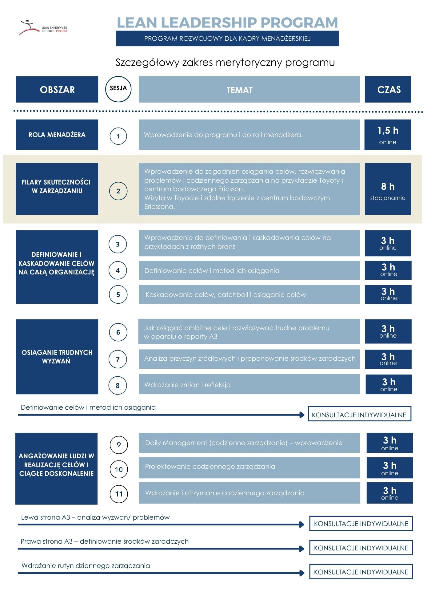 Program składa się z 11 sesji merytorycznych, w tym 10 sesji on-line live oraz 1 całodziennej sesji stacjonarnej połączonej z wizytą benchmarkingową. Dodatkowo uczestnicy w trakcie programu wdrażają poznane metody w swojej pracy tak, aby przełożyło się to na wyniki. W tym celu każdy uczestnik otrzymuje 4 indywidualne konsultacje z ekspertem.